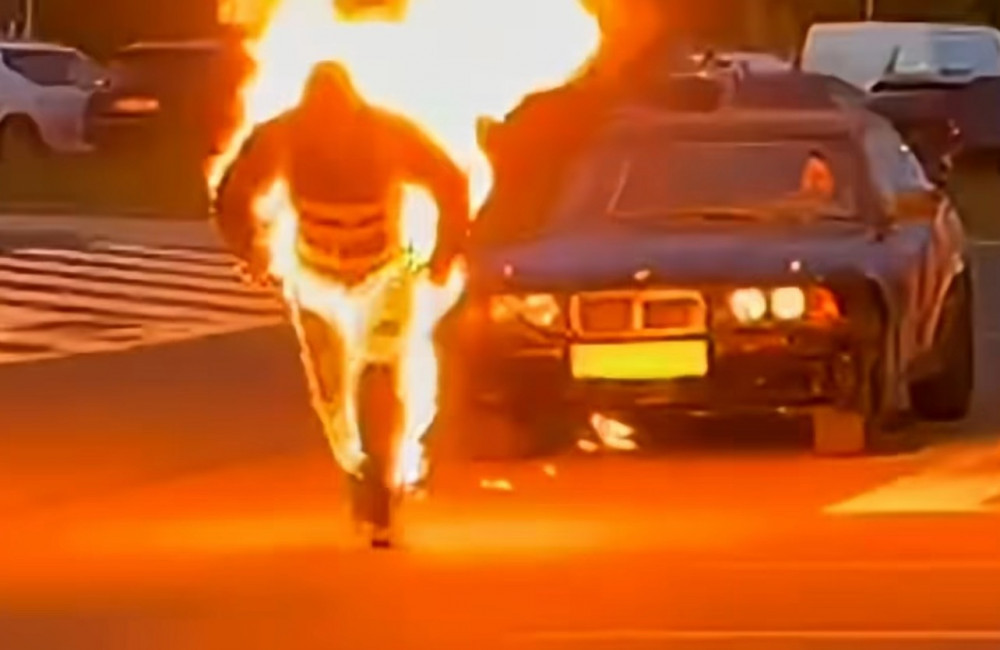 By 2022, he swapped four wheels for two, cycling 200 m while ablaze on Italian TV show Lo Show dei Record in 49.55 seconds. And in 2023, he even took to the skies, zipping 61.45 m down a wire while engulfed in flames.